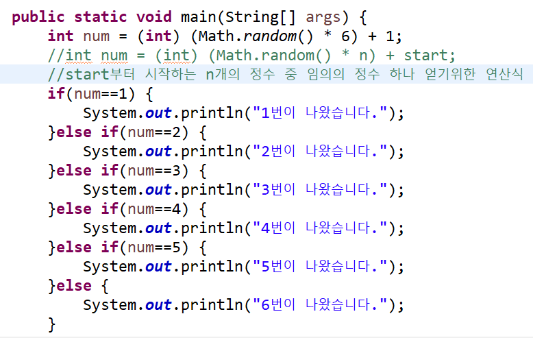 int num = (int) (Math.random() * n) + start; start부터 시작하는 n개의 정수 중 임의의 정수 하나 얻기위한 연산식